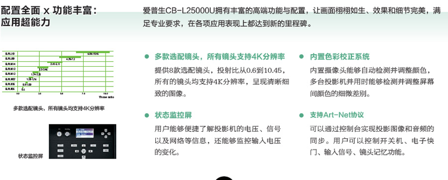 連續使用的場合。激光光源出色的散熱特性獲得了360度自由安裝能力,寬變焦范圍電動鏡頭帶有鏡頭記憶功能,提供出色工程適應性。內置色彩校正、邊緣融合、曲面校正系統為安裝使用帶來方便。內置對DMX-ArtNet協議的支持,滿足各類創意投影應用需求。 |