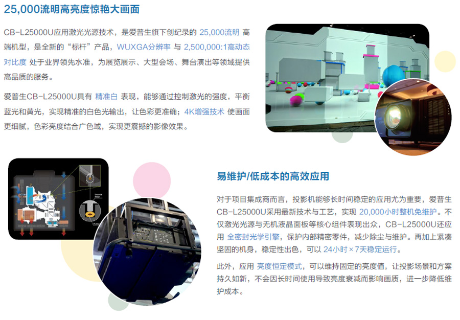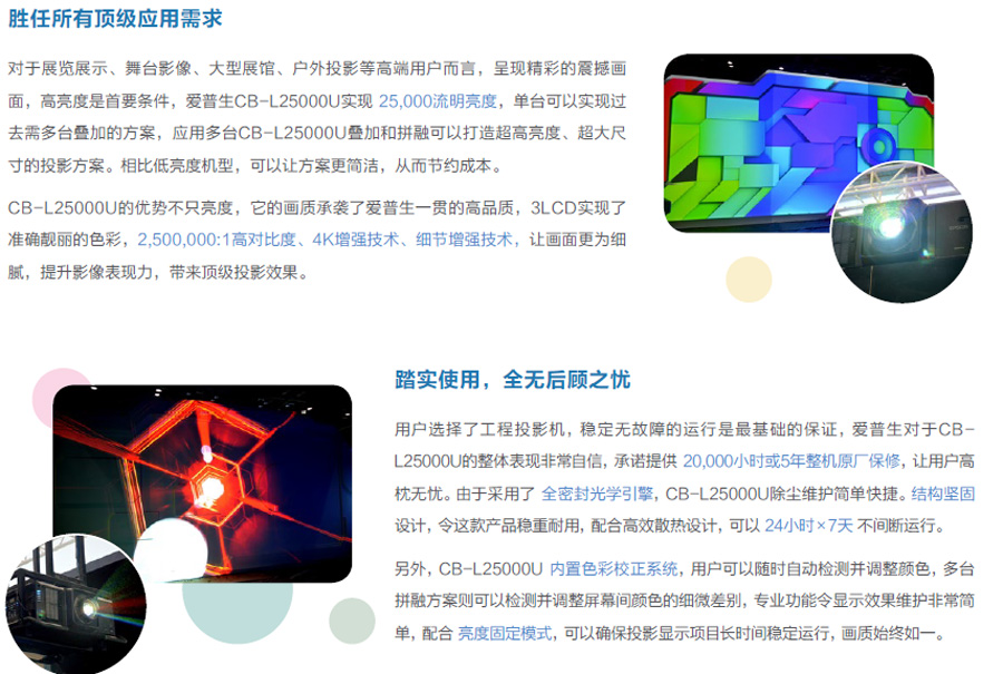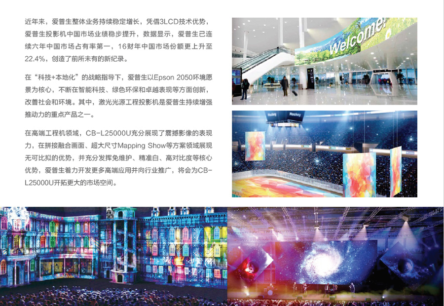 隨著行業的發展和用戶需求的提升,高端工程影像市場份額穩步提升,愛普生發揮技術實力與創新能力,為舞臺演出、戶外投影、展覽展示等高端領域帶來了高亮高畫質的解決方案。 |