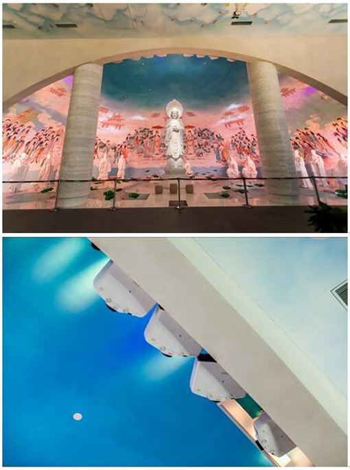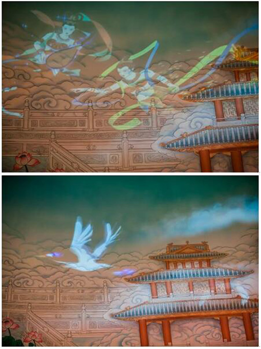 打造這一“天外飛仙”奇景的,是安裝在佛像前方巖壁上方的8臺愛普生工程投影機。由于壁畫本身色彩艷麗,投影的元素需要足夠清晰鮮艷,才能達到“虛實合一”的視覺效果。愛普生工程投影機自帶的3LCD核心技術,能夠以平滑的色彩變換實現卓越的圖像質量,讓顏色更鮮艷繽紛。同時,其所搭載的插幀技術,能夠通過分析圖像數據,在兩個原始畫面之間創造出新的畫面,讓漂移的“云朵”、“仙女”和“仙鶴”們更加平滑、清晰、順暢,仿佛與壁畫融為一體,動中有靜,美輪美奐。