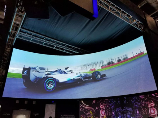 走進愛普生展位,在一塊5.76 x 2m的曲面巨幕前,激烈的F1大賽,讓我們仿佛置身賽事現場。