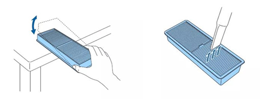 除了鏡頭,空氣過濾器也極容易積聚灰塵。當粉塵大量附著在空氣過濾器上,出現“請您清除投影區域的任何障礙”的提示時,就意味著需要清潔空氣過濾器了。