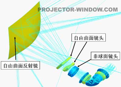 其中,自由曲面反射鏡在不發生倍率色彩像差的基礎上,可以補正歪曲像差。傳統投影機投射光線須垂直于屏幕進行投射,角度的偏離會造成影像的歪曲變形,而日立A8投影機則是置于屏幕斜上方,光線由多組鏡頭折射后投射到自由曲面反射鏡上,反射鏡再以傾斜的角度將畫面完美的投射到屏幕上,其原理是自由曲面反射鏡將鏡頭投射進來的光線按不同的角度散射出去,依據自由曲面反射鏡來做梯形校正,使投射在屏幕上的影像毫無扭曲和歧變。