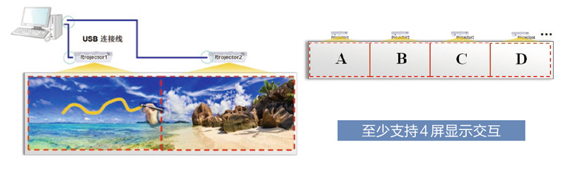 使用多投影機拼接成大畫面時,仍然可以在多屏幕間繪圖書寫,至少可支持4屏幕顯示交互。