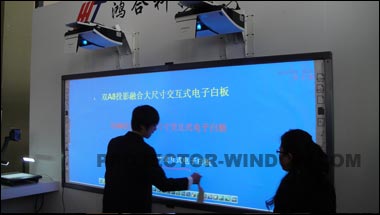 值得一提的是,鴻合雙A8投影機搭配16:9格式的122寸紅外框也在現場進行了展示。該產品核心采用“多功能紅外組合觸摸”技術,整體框架式設計,由密布在顯示區四周紅外接收和發射對管形成水平和垂直方向的掃描網格,形成一個掃描平面網,當有可以阻擋紅外光的物體阻擋住網格中的某對水平和垂直紅外掃描線時,就可以通過被阻擋的水平和垂直方向的紅外線位置確定X,Y坐標。其精準的定位和超快的反應速度為用戶帶來高效的教學體驗。在設計工藝上,該產品應用器件通用技術,其內部的PCB板可通用、獨特的防塵結構保證了產品的穩定性、無線接口的設計選擇可讓用戶靈活切換主電腦,所有設計充分體現出“節能環!焙汀叭诵曰O計”的特點,進一步彰顯鴻合科技自有品牌的研發活力和制造實力。