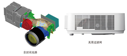 首先在保證長期使用穩定品質方面的一大亮點,是全封閉的光路設計,并將色輪密閉在整個光路中,無需過濾網即可避免灰塵進入核心部件,并為用戶節省了更換過濾網的成本。眾所周知,以往的投影機產品大多在關機后還需風扇散熱,這時候一旦意外斷電,很可能造成投影機的損壞。而NEC