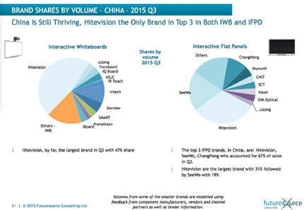 與此同時,中國交互智能平板市場中“兩強相爭”的局勢,隨著鴻合科技領(lǐng)先優(yōu)勢的進一步擴大,正初步顯現(xiàn)出了一家獨大的態(tài)勢。Futuresource針對中國市場的統(tǒng)計數(shù)據(jù)顯示,2015年第三季度,鴻合HiteVision交互智能平板市場份額首度突破三成,以31%的銷量占比再度奪冠,希沃則以19%的銷量占比位居第二,長虹排名第三,占比17%。