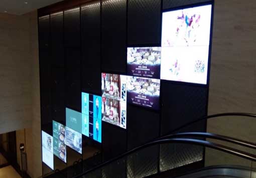 7臺55寸顯示屏為顧客提供觸摸查詢導購,另有7臺安置在電梯轎廂中,全方位的顯示各商鋪地圖位置,幫助顧客方便查詢去向;在商場南北區,鴻合智能(HVS)部署了28臺扶梯55寸拼接屏,以異型拼接的方式,讓顧客在美景中漫步,帶來更佳的視覺享受。