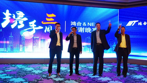 11日晚,鴻合科技與NEC在北京Infocomm盛會期間歡聚,高層領導到場,來自全國各地的重要合作伙伴與渠道商朋友齊聚一堂,共襄盛舉,慶祝鴻合與NEC攜手三周年。
