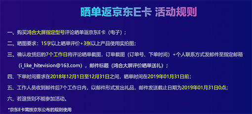 即日起至12月31日,購買鴻合商用交互平板指定型號,2019.1.31前曬單最高返3000元京東E卡。
