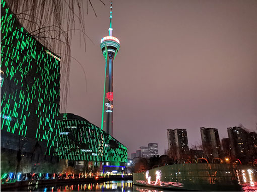 元宵佳節,電視塔又上演了“2019夢想之塔光電煙火秀”,吸引數萬人前來觀看,并在5G等技術的助力下,通過全景視頻直播呈現到全球觀眾面前,讓成都備受全國矚目。這場表演結合燈光秀+煙火秀+音樂秀,整整持續了10余分鐘,結合璀璨的煙花,塔身由投影呈現出的多彩變幻的畫面將現場氣氛推至高潮。