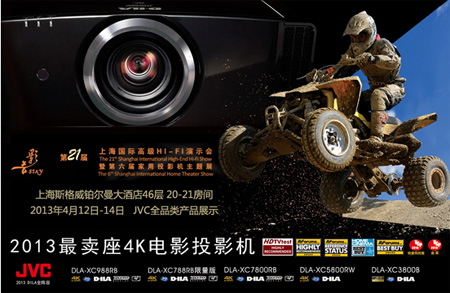 [投影之窗消息]  第21屆上海國際高級HI-FI演示會,暨第六屆家用投影機主題展將于2013年4月12日-14日位于上海斯格威鉑爾曼大酒店(打浦路15號)再次拉開帷幕。JVC將攜全新4K高端家庭影院投影機、JVC木質振盆音樂系統、JVC新概念時尚音響、JVC 高端時尚耳機等系列全陣容華麗登場,更有JVC最上位機型EX-A3000及未公開銷售ésnsy耳機作為本次影音展的主要亮點。