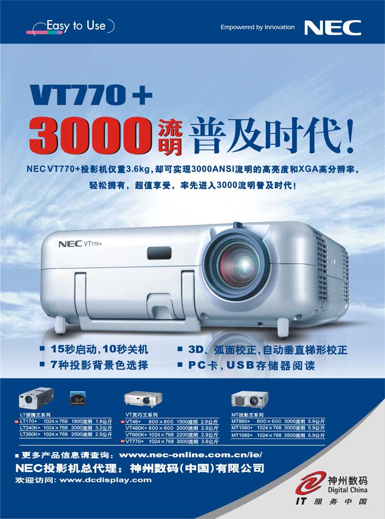 NEC VT系列投影機(jī)又添新丁,最新推出一款便攜式投影機(jī)VT770+。此款機(jī)型采用0.8英寸液晶面板,實(shí)現(xiàn)3000 ANSI流明的亮度,XGA分辨率以及400:1的對(duì)比度。該產(chǎn)品在梯形校正方面延續(xù)了NEC的3D幾何校正功能,同時(shí)對(duì)背景色的校正功能可以實(shí)現(xiàn)多種場(chǎng)合及有色墻壁上進(jìn)行投影。 |