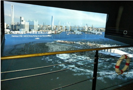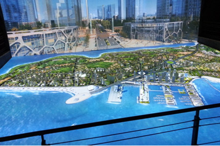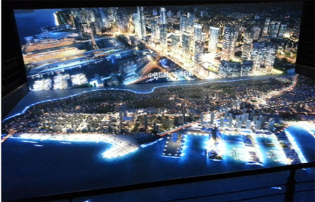 不僅如此,該展廳顯像方案雖由多臺投影機共同作用,但其融合效果非常好,投射出的畫面無邊縫感、色差極小。在展出過程中,其夜景和沙盤的展示俘獲了眾多消費者的心,在投射規劃區的夜景時,該方案展示出的畫面對比度高、景深層次豐富、錯落有致,使夜幕籠罩下的海港城看起來流光溢彩,美不勝收。而沙盤中的海水、植被等自然風景畫質也同樣細膩,逼真的水流甚至讓不少參觀者不禁伸手去一探究竟,達到了良好的展示效果。