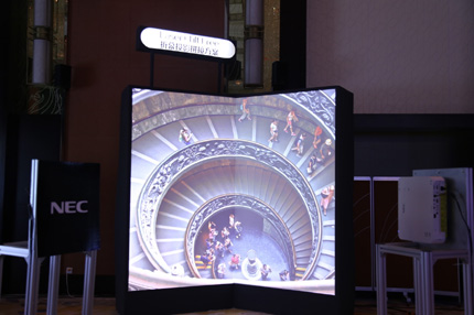 為應對商場櫥窗、酒店娛樂等行業需求。NEC還在現場展示了折幕投影拼接解決方案,該方案采用NECP502HL+工程投影機,具有全高清分辨率,20000小時超長壽命,大范圍鏡頭位移(位移達到了62%),支持左右鏡頭位移(位移達到28%),并且支持360度投影和豎向投影,功能極為齊備。