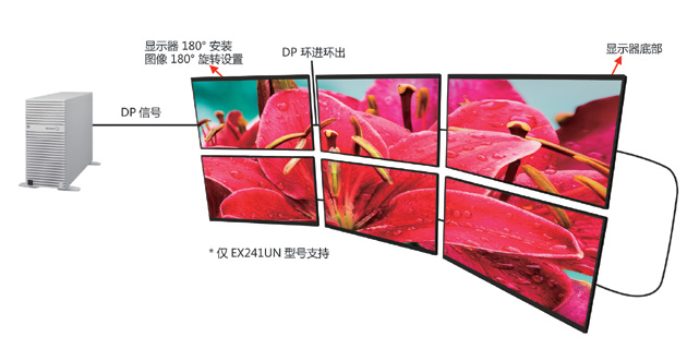 Matrix自拼接功能,在無需外設(shè)的情況下可輕松實(shí)現(xiàn)5*5的拼接方案。此拼接方案不似以往的普通拼接,由NEC自拼接功能加之圖像180度翻轉(zhuǎn)和顯示器180度安裝、DP視頻信號(hào)環(huán)出來實(shí)現(xiàn)。
