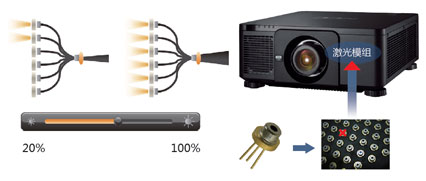 100%亮度調節、激光光源采用多模組結構,如果有一個激光二極管出現故障,對整體亮度影響很小,無黑屏風險,更加穩定可靠。