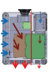 采用NEC最新的全分離式氣流散熱系統,投影機內部分成左右2個獨立的散熱空間,具有獨立的進入口和出氣口,形成2