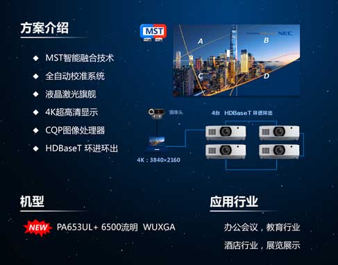 NEC發布的產品有:旗艦產品PH3501QL+、PH2601QL+雙色激光4K工程投影機,PA803UL+、PA653UL+液晶激光高清工程投影機,以及PA803U+、PA653U+、PA853W+、PA703W+、PA903X+等5款液晶工程投影機。尤其是PA系列液晶激光投影和亮度高達35000流明的PH3501QL+系列雙色激光投影機,有力的加強了NEC激光投影產品線布局。目前,NEC激光投影機全線產品布局已經全面覆蓋了液晶&DLP兩大投影顯示技術,單色&雙色&三色全線激光光源技術等各個技術維度,并通過與鴻合科技的強強聯合,強力滲透各個領域和渠道,為用戶帶來整體解決方案和周到細致的服務。
