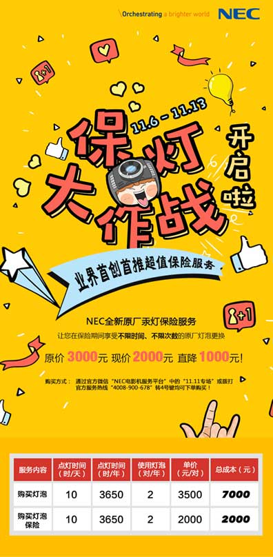 購買方式:NEC全新原廠汞燈保險服務和光影行動通過官方微信“NEC電影機服務平臺”中的“11.11專場”或撥打官方服務熱線“4008-900-678”轉4鍵均可下單購買!延保服務除以上兩種購買渠道外,還可在授權代理商處進行購買!切記,通過400電話下單后,NEC會出下單合同,合同簽字確認后方為下單成功。