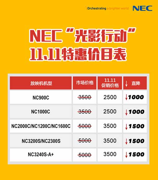 光影行動是NEC于2012年率先推出的品牌特色增值服務,通過全面清潔保養,大幅提升放映機亮度。年關將至,為避開年底維護高峰期,讓您的機器提前得到貼心保養,完美迎接賀歲檔,NEC特推出光影行動首次促銷,讓您的放映機更明亮動人,原本買三臺才能享受的優惠價,現在買一臺即能盡情享受,折扣低至七折!最高直降1500元,這是光影行動自2012年以來的首次促銷,超值特惠,不容錯過!