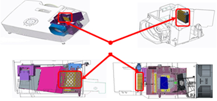 利用投影機(jī)內(nèi)部燈泡產(chǎn)生之紫外線照射至觸媒,并經(jīng)由散熱風(fēng)扇之運轉(zhuǎn),達(dá)到室內(nèi)空氣循環(huán)清凈功能;此光觸媒元件安裝于投影機(jī)內(nèi),完全不需更換亦不會衰減。