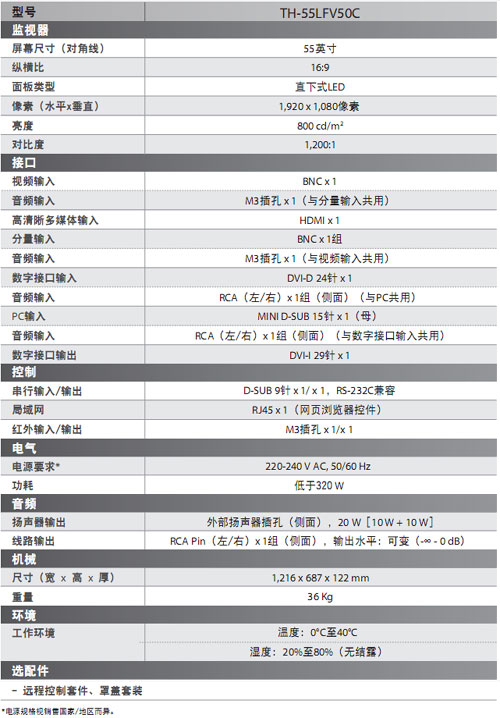 世界著名的電器生產廠商松下,推出窄邊框設計實現近乎無縫的大型顯示牌拼接產品--55英寸TH-55LFV50C超窄邊框液晶監視器。產品具有低耗電、節能環保等特性,為客戶提供有效方案應用的同時具有環保、節能特性,作為“國際性綜合電子技術企業”,松下始終以提高人們的生活質量和為世界文化做貢獻作為社會使命。