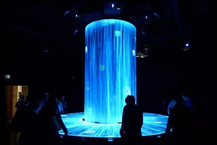 “多樣性瀑布”由一個(gè)巨大的柱子和環(huán)繞柱子的平臺構(gòu)成,可以讓參觀者進(jìn)行互動體驗(yàn)。該裝置共采用了10臺PT-FDZ97C投影機(jī),其中4臺投射到柱子上,另外6臺投射到平臺上。