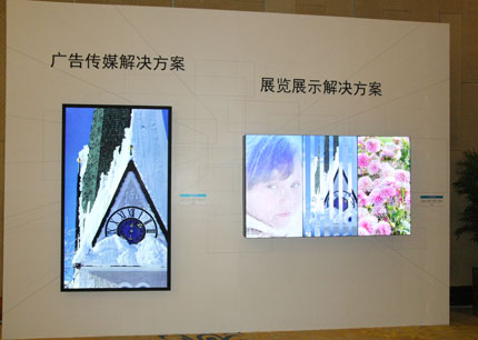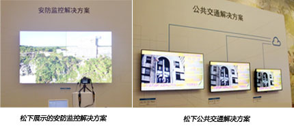 松下展示的安防監控解決方案針對安防監控行業打造,由2×2四臺TH-55VF1HC超窄邊框液晶拼接屏幕實現,TH-55VF1HC的邊框只有0.9mm厚,整體拼接屏幕的拼縫厚度僅為1.8mm,成為目前市場中最尖端的畫質表現。松下公共交通解決方案展示了通過云服務器進行控制的公共交通信息顯示系統,三臺屏幕分別為:55英寸的TH-55SF11MCA、49英寸的TH-49SF11MCA和43英寸的TH-43SF11MCA,讓指揮、部署與管控更加便捷。