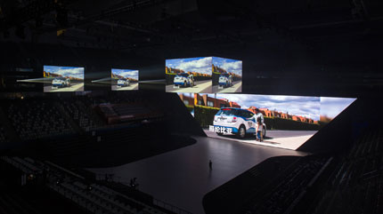 本次比亞迪品牌之夜活動采用10臺30,000流明的PT-SRZ31KC松下激光工程投影機,投射畫面左右橫跨上海東方體育中心,其中7臺單打10.6×6米高空中的7塊大屏幕,單打亮度堪比LED,3臺全部投射地面并進行邊緣融合,呈現超大畫面的震撼效果。