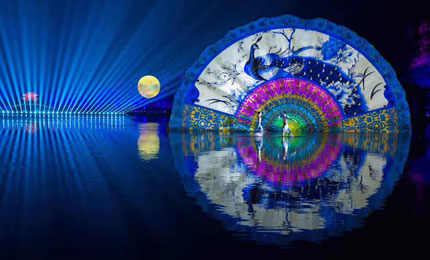 巨型折扇從水下至水面緩緩展開,折扇半徑長11米,而扇面美輪美奐的彩畫則是由四臺12,000流明的松下工程投影機PT-SRZ12KC打造,投射距離32米。PT-SRZ12KC搭載松下特有的SOLID