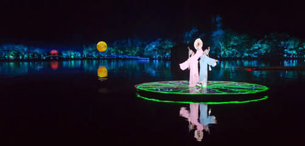 夜幕降臨,樹影綽約,平靜的湖面上升起皎潔的明月。作為演出中最重要的元素之一,這輪明月直徑8米,由4臺30,000流明的松下工程投影機PT-SRZ31KC完成投影特效,投射距離96米。PT-SRZ31KC是松下激光工程投影機家族里最閃亮的明星,其精彩的高亮度、卓越的色彩表現力和先進的實物投影技術,使“超級月亮”清晰而逼真。月光之下,《梁山伯與祝英臺》感人的愛情故事在水面舒展,講述著古老的中華文化,傳遞人類共同的美好情感。