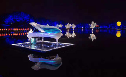 山水之間,潔白的鋼琴閃動著夢幻的光影,這臺鋼琴使用1臺松下工程投影機PT-SRZ12KC將光與影,景與人完美結合,為水天絢麗的景色增添了西方文化的魅力。