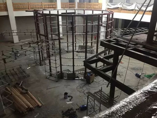 一個直徑約為6米,高約5米的全鋼架環形造型,中間有兩個對稱的通道,環形的中心是一座直徑約0.5米,高2米的杜甫雕塑。這就需要考慮到:投影機的安裝位置、中間雕塑是否擋光、投影光會不會照射到人眼、紗幕安裝、音響安裝等一系列問題。最后,技術人員通過在模型鋼架上焊接方鋼,然后將投影機吊架焊接在方鋼上的方式將投影機吊裝。造型上沿有一個約25公分的槽,投影機安裝好后尾部距離墻面還有15公分的空隙。紗幕的不銹鋼導軌就安裝在空隙內,同時音響也裝在槽內并用紗幕遮擋。