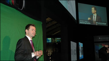[投影之窗消息] 在一個綠屏前,projectiondesign市場總監(jiān)--安德斯洛克介紹說,作為最具創(chuàng)新性的產(chǎn)品線的一部分,projectiondesign陳列一個完整的投影線的專業(yè)應(yīng)用范圍,其中是F35