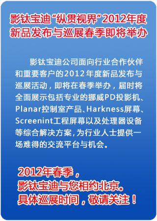 這和與影鈦寶迪良好的合作不可分開。影鈦寶迪是中國市場專業從事高端顯示產品的分銷商和顯示系統集成商,具有良好的知名度。公司不僅與許多的國際廠商建立了良好的合作關系,同時與大量的國內系統集成商建立了密切的合作,在全國建立了完善的銷售服務體系。影鈦寶迪作為projectiondesign投影機在中國的認證經銷商和服務商,為projectiondesign專業投影機市場的發展與推廣投入很大力量,先后完成了眾多行業知名案例,有廣泛的客戶資源與系統方案解決能力。