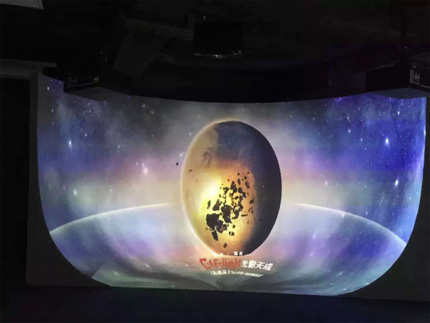 UMAX沉浸式激光影院,是通過多臺激光投影拼接融合形成一個U形的具有超寬觀看角度的大屏畫面。選用了三臺視美樂激光投影機通過特制融合電腦進行球面融合,形成一個直徑為5米的1/4球形畫面。其獨特的異形影像、極富沉浸感的空間,充分體現了投影顯示的靈活性以及激光顯示的高清高亮,色彩表現絕佳的優勢!