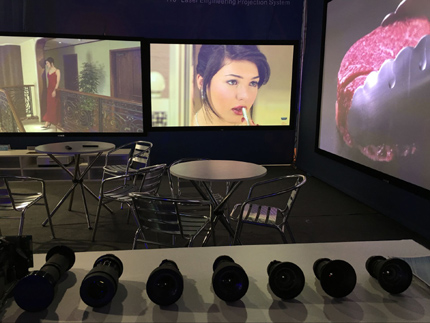 IFC China現場,視美樂全線工程機及鏡頭也進行了集中展示。視美樂擁有幾十個專利,僅僅是鏡頭方面的專利便多達數十種,視美樂長短焦鏡頭品種多樣,適配于多個品牌的機型,如松下、索尼、愛普生、夏普、科視等。此次展出的全線工程機也都為視美樂2.5代工程機,相比傳統2代工程機效果都有非常大的提升,整體亮度與色彩也都有較大提升,而且新光源的壽命也得到大大提升。從2016年下半年開始,視美樂全新2.5代機已實現量產,屆時數十個產品將全面沖擊市場。