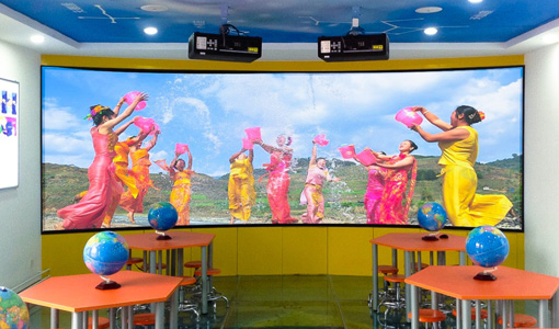 地理課堂受環境限制,無法讓學生真正走到戶外去學習。僅靠書本和想象無法直觀感受事物的面貌,導致學生往往學習熱情不高,注意力分散。“環幕示教”使用兩臺SML-PF550高亮激光工程機,搭配300吋超寬屏弧幕,在學習《西雙版納地方風俗》時觀看潑水節紀錄片,超大畫面、超寬視野帶來強勁的視覺沖擊力,讓學生們身臨其境,感受傣族人民溢于言表的喜悅,愛水敬佛的民族特性。