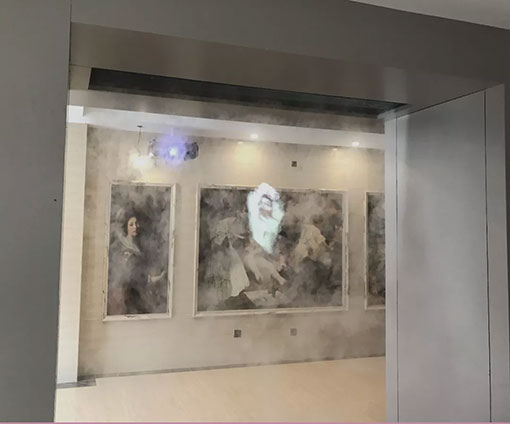 海市蜃樓般憑空出現的影像籠罩在一層若有似無的水霧中,隨著水霧的流動,時而清晰,時而分散,讓人忍不住想伸手去觸摸。就像哆啦A夢的任意門,當你與影像擦肩而過的一瞬間,世界突然靜止,唯獨水霧微微晃動,波紋般漾開,回過神來,一腳已經踏入了異時空。