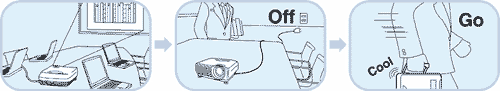 特別設計的“Off&Go”功能,在拔掉電源后,散熱系統仍能繼續運作,這樣就能把投影機關掉,同時可立即移到別的地方使用,大大節省時間。
