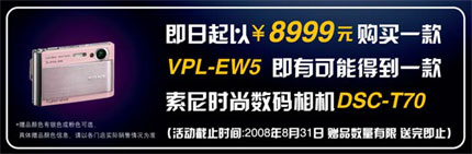VPL-EW5投影儀就有可能獲得一款Sony時尚數碼相機DSC—T70,早到早得!”,消息一經發布,便引起眾多用戶的駐足與討論,毫無懸念,在今年的炎炎酷夏,Sony將再次創造高質優價的市場神話。