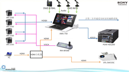 Sony BRC系列高清云臺攝像機設置的4個攝像機機位分別拍攝教師全景、教師近景、學生全景和學生近景,一個云臺攝像機控制面板允許控制各攝像機的俯仰搖移及變焦;SonyAWS-750無限傳播工作站作為一臺高性能的高清切換臺,可以同時接入所有云臺攝像機的視頻信號及教師的電腦信號,提供非常豐富的畫面制作效果,并同時完成高清記錄和流媒體推送功能。配置的DWZ系列音頻話筒則可收錄老師和學生多路音軌,并提供強大的抗嘯叫能力。
