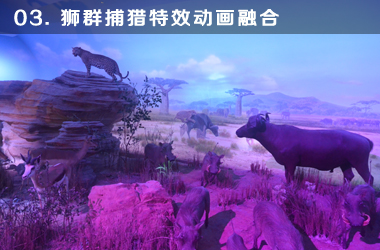 該方案同樣運用了較為成熟的投影蒙皮技術,通過將定制化的特殊片源投影到具有逼真影像內容的背景板上,讓投影畫面與背景板的內容進行很好的融入與配合,從而實現亦真亦幻的奇妙視覺效果,通過與背景板前方標本的對比參照,一幅獅群捕獵的特效動畫得以活靈活現地發生在觀眾眼前,由于投影機隱藏較好,觀眾很難發覺動態影像的實際來源。 |