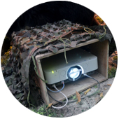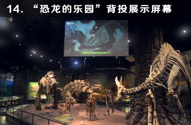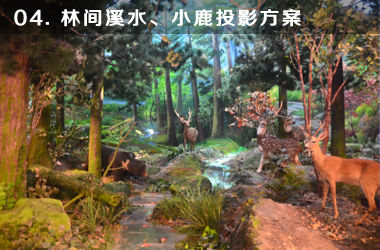 該展項運用了實物標本、背景幕布搭建出活靈活現的北美食草動物生活場景,為了突出整體場景的真實性及逼真動態效果,使用了一臺索尼高亮度工程投影機吊頂安裝,將特殊定制的動態視頻內容投影到背景板之上,讓虛擬動物以不同的姿態活融入到背景板的場景之中,從而形成了虛實結合、賦有層次感與立體視覺效果的展項構造,