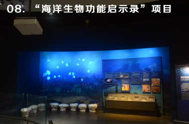 這套展項是天津自然博物館新館投影技術運用的又一典型代表,高亮度畫面輸出、復雜背景幕布、定制化投影內容以及與周圍環境搭配融合等等技術在這一方案中都有著顯著體現。該展項通過背景板與投影的結合向觀眾傳遞“海洋生物功能啟示錄”這一主題,吊頂安裝的索尼高亮工程投影機將亦真亦幻的水母影像投影在湛藍的背景板上,奇幻、靈動、美妙的觀感悠然而生,讓整個展項充滿詩意。 |