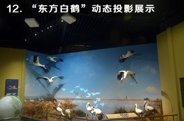 這套展項同樣利用了大幅背景幕布、真實動物標本、虛擬投影影像共同打造,方案中將白鶴標本用各種靈活的方式布置與大幅的背景幕布之前,投影機投影的白鶴起舞、生活的動態視頻投影與背景板之上,也真實的白鶴標本形成鮮明的呼應與對照,從而形成了一幅現實與虛擬、平面與立體、靜態與動態的生動視覺畫面,方案中兩臺索尼工程投影機的巧妙運用成為該展項的一大特點。 |
