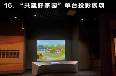 這套展項充分運用了走廊間的空白墻壁,將走廊中觀眾休息區打造成一面播放宣傳影片的簡易展覽廳,其中運用純色墻壁作為投影幕布,將一臺索尼高亮工程投影機吊頂安裝作為畫面輸出設備,而走廊中的觀眾休息座椅擇成為了簡易展覽廳的觀影座椅。當逛累了之后,坐在走廊的休息區的觀眾也能一飽眼福,只要稍稍抬頭就能欣賞到“開拓嶄新家園”介紹短片,舒適而愜意。 |