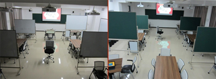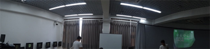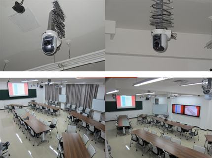 在502教室里面,安裝有4臺索尼EVI-H100S-W攝像機并預留一個攝像機的位置。502作為分組討論學習特色教師,通過中間四臺投影把教室分為四個部分,索尼的攝像機可以拍攝教室的全景畫面,也可以拍攝各個小組的畫面。 |