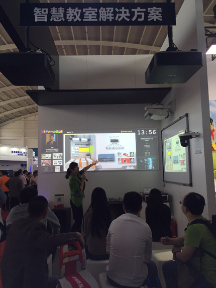 投影機(jī)在教學(xué)中的重要度毋庸置疑,這次教育展索尼同樣展示了陣容強(qiáng)大的教育投影機(jī)家族。特別展示了于2015年底上市的新品VPL-EX340,這臺(tái)投影機(jī)集高亮度,高畫質(zhì),良好的防塵特性等優(yōu)點(diǎn)于一身,適用于高校及企事業(yè)單位。在投影機(jī)展示區(qū),由四臺(tái)亮度為4200流明的VPL-EX340投影機(jī)分別投射寬度為1米的幕布,呈現(xiàn)良好的圖像效果。同時(shí),在投影機(jī)靜態(tài)展示區(qū)域,長(zhǎng)焦,短焦,超短焦,小高清,多種亮度、不同焦距和分辨率滿足客戶多元化的需求的索尼商教投影機(jī)家族也作了集體華麗亮相。