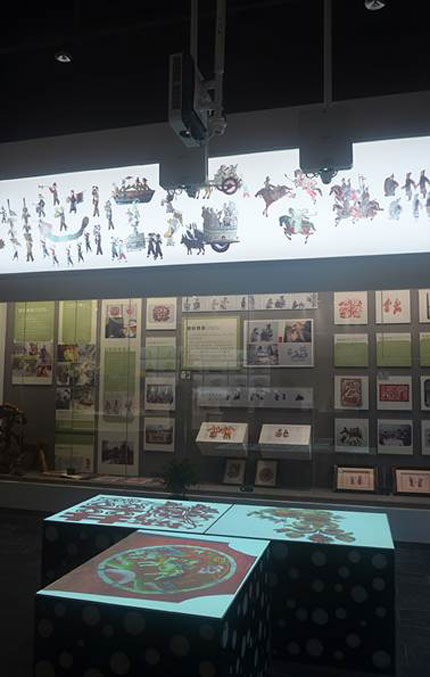 在手工藝展區,“剪紙”和“刺繡”都是重要展項,巧奪天工的各類剪紙和刺繡作品讓人大開眼界,大多數作品尺寸較小,以精致細膩為亮點,而且還要收藏保存。如何能夠仔細鑒賞這些精巧的作品呢?展館應用了互動桌面投影系統,三臺索尼VPL-F500X投影機吊置安裝,將剪紙畫面垂直投影在特制的“桌面”上。應用這一系統,剪紙與刺繡作品的細節毫厘畢現,讓人們仔細觀賞。并且,這一系統還增加了交互功能,人們可以像翻書一樣,隨意欣賞豐富的剪紙與刺繡作品。